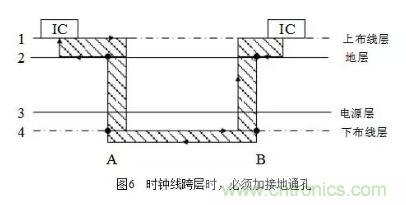 在布線時盡量少穿過孔,因?yàn)檫^孔阻抗和線阻抗不一樣,存在阻抗突變,從而產(chǎn)生駐波使信號變壞,容易形成輻射,尤其是在時鐘需要穿層時,要做技術(shù)處理,時鐘線跨層時的處理如圖6所示。