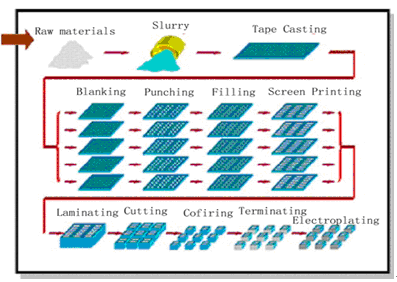 LTCC技術(shù)是于1982年休斯公司開發(fā)的新型材料技術(shù),是將低溫燒結(jié)陶瓷粉制成厚度精確而且致密的生瓷帶,在生瓷帶上利用激光打孔、微孔注漿、精密導(dǎo)體漿料印刷等工藝制出所需要的電路圖形,并將多個被動組件(如低容值電容、電阻、濾波器、阻抗轉(zhuǎn)換器、耦合器等)埋入多層陶瓷基板中,然后疊壓在一起,內(nèi)外電極可分別使用銀、銅、金等金屬,在900℃下燒結(jié),制成三維空間互不干擾的高密度電路,也可制成內(nèi)置無源元件的三維電路基板,在其表面可以貼裝IC和有源器件,制成無源/有源集成的功能模塊,可進一步將電路小型化與高密度化,特別適合用于高頻通訊用組件。
