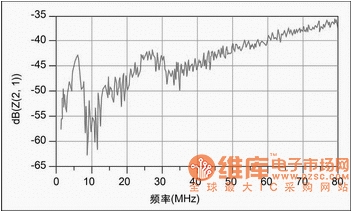 測試電源系統(tǒng)性能時,通常使用網(wǎng)絡分析儀,測試對象是電源系統(tǒng)的self-impedance和transfer-impedance。一般情況下,電源系統(tǒng)的阻抗均遠小于網(wǎng)絡分析儀系統(tǒng)阻抗(50歐姆),所以測試時只要做直通校準就可以了,利用公式s21=z/25就可以得到電源系統(tǒng)的阻抗。圖2所示為某單板電源阻抗特性。
