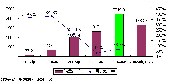 - 賽迪顧問預(yù)計(jì)2008全年,中國(guó)機(jī)頂盒銷量突破2000萬臺(tái)大關(guān),達(dá)到2219.9萬臺(tái)