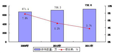圖2 2009-2011年中國(guó)便攜式電子學(xué)習(xí)產(chǎn)品市場(chǎng)銷(xiāo)售量及其發(fā)展速度預(yù)測(cè)