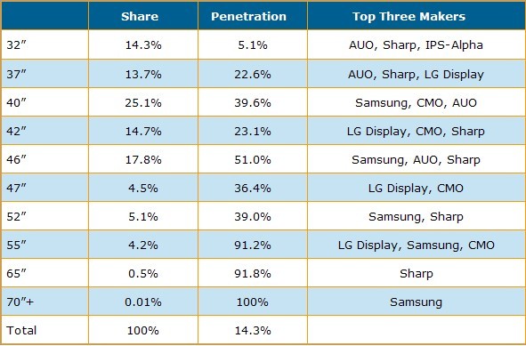 從尺寸別來(lái)看第一季雙倍頻液晶電視面板出貨結(jié)果,40寸是最主要的出貨尺寸,出貨量比重達(dá)25.1%,46寸以17.8%暫居第二,42寸以14.7%市占率排名第三。而采四倍頻技術(shù)液晶電視面板出貨則集中在40、46與52寸等較大尺寸面板。