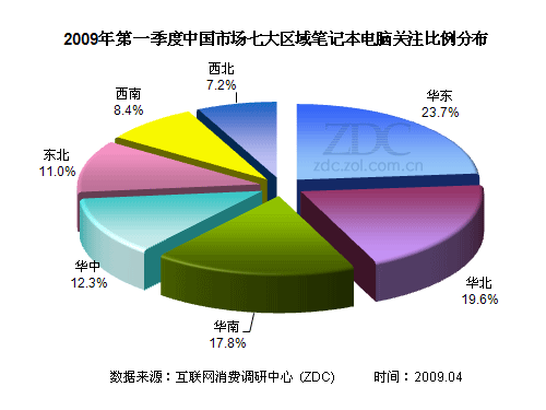 (圖) 2009年第一季度中國(guó)市場(chǎng)七大區(qū)域筆記本電腦關(guān)注比例分布