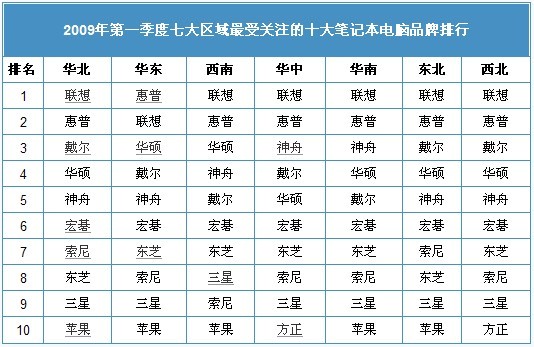 ZDC調(diào)查結(jié)果顯示,在全國(guó)七大區(qū)域筆記本電腦市場(chǎng)上,聯(lián)想與惠普的冠軍爭(zhēng)奪戰(zhàn)較為突出,最終聯(lián)想勝出,除華東地區(qū)的冠軍之位被惠普奪得之外,其他地區(qū)聯(lián)想均穩(wěn)居冠軍的寶座。