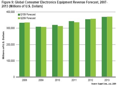預計全球消費電子營收仍將下降8.2%,從2008年的3,350億美元下降到約3,080億美元。但iSuppli估計2010年市場將開始復蘇,營收將增長2%,達到3,140億美元。預計未來五年將實現(xiàn)持續(xù)增長,到2013年達到3,700億美元。