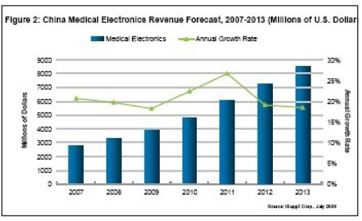 瑞銀集團(tuán)(UBS)的投資部門(mén)估算,醫(yī)院補(bǔ)貼中的三分之一,相當(dāng)于141 億美元,將用于初級(jí)醫(yī)院購(gòu)買(mǎi)新的醫(yī)療設(shè)備。即使這項(xiàng)政策的執(zhí)行有所滯后,這141 億美元也將推動(dòng)醫(yī)療設(shè)備產(chǎn)業(yè)每年增長(zhǎng)20%。由此可以預(yù)計(jì),未來(lái)三年醫(yī)療電子市場(chǎng)的年增長(zhǎng)率將超過(guò)25%。