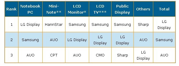 - Samsung奪魁,營收達(dá)到42億美元,并占總體TFTLCD出貨營收的27.8%