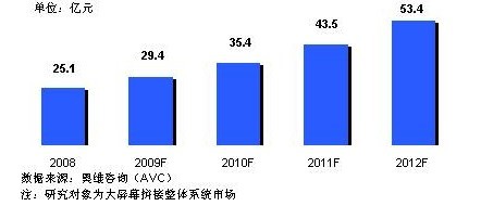 屏幕拼接市場已經(jīng)進(jìn)入快速成長期,據(jù)奧維咨詢(AVC)《中國大屏幕拼接市場研究報(bào)告》顯示,2008年中國市場規(guī)模約為25.1億元,2009年雖然遭遇經(jīng)濟(jì)大環(huán)境的影響,預(yù)計(jì)仍將增長17%左右,市場規(guī)模將達(dá)29.4億元。市場的成長主要得益于國家對能源、交通等基礎(chǔ)建設(shè)的大規(guī)模投入,以及09年全運(yùn)會(huì)、10年世博會(huì)、亞運(yùn)會(huì)等大型賽會(huì)事的拉動(dòng)。