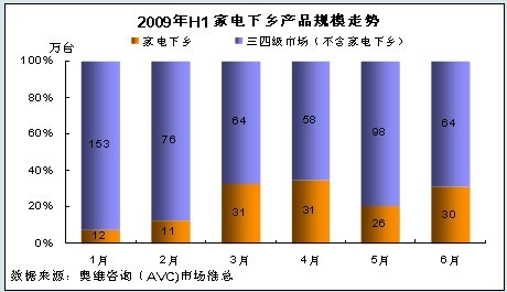 根據奧維咨詢(AVC)對家電下鄉(xiāng)市場的監(jiān)測以及對全國市場零售規(guī)模的評估,2009年1-6月份彩電下鄉(xiāng)零售規(guī)模為141.09萬臺,占三四級市場的總量的21.54%。