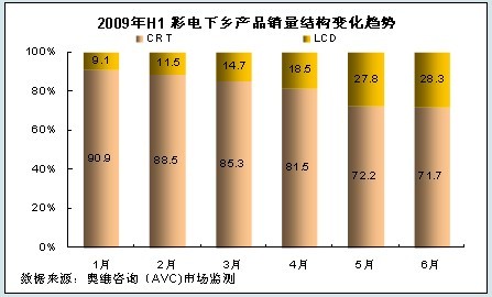 隨著LCD電視產品價格的不斷下降,在城市市場LCD電視對CRT電視的替代率在不斷增加,目前CRT電視在城市市場已經處于一個補充的從屬地位,農村市場已經成為CRT產品銷售的主要市場。從彩電下鄉(xiāng)的銷售數據來看,2009年上半年CRT銷售占家電下鄉(xiāng)銷售總量的79.94%,仍占據彩電下鄉(xiāng)的主導地位;從銷售比重的走勢看,LCD正不斷侵蝕CRT的市場,其中尤以4、5月份侵蝕速度最快。