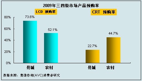 奧維咨詢(AVC)對主要下鄉(xiāng)省份的三四級市場研究結果顯示,在有計劃于2009年購買彩電產品的人群中,他們更傾向于購買LCD產品,;而即使在農村市場,CRT產品的預購率仍要低于LCD產品,扣除消費者購買能力因素,LCD在農村市場的被接受程度仍然較高。