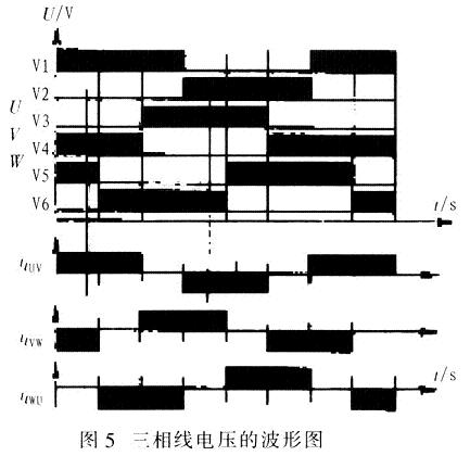 (5)由V1~V6組成的橋式三相逆變主電路是逆變器的核心電路。圖4為三相逆變器的主電路圖,輸入端為A、B,輸出為U、V、W。圖5中V1~V6的導(dǎo)通順序,陰影部分為各個(gè)IGBT的導(dǎo)通時(shí)間。每一格的時(shí)間為π/3,三相線(xiàn)電壓的波形如圖5所示。