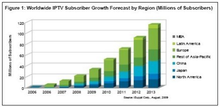 好消息是,在目前經(jīng)濟(jì)沉陷衰退之際,IPTV的好處已經(jīng)顯現(xiàn)出來(lái)。2008 年第四季度和2009 年第一季度,IPTV經(jīng)受住了經(jīng)濟(jì)衰退的沖擊,2009年有望增長(zhǎng) 56%,用戶數(shù)量增到 3330萬(wàn)個(gè)。2008年全球用戶數(shù)量是 2130萬(wàn)。