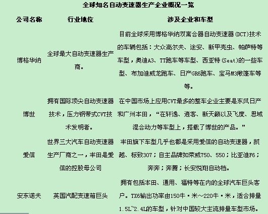 - 中國市場(chǎng)對(duì)自動(dòng)變速器研發(fā)生產(chǎn)的渴求早就引來了諸多國際自動(dòng)變速器企業(yè)