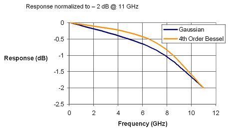Gaussian響應(yīng)在-3dB之后仍衰減很慢。其優(yōu)點(diǎn)是允許被測信號的更高頻率成分的諧波能量通過放大器(這是假定其有采樣率遠(yuǎn)超過Nyquist),對于特別快的快沿測量有幫助。其缺點(diǎn)是在低頻段使被測信號嚴(yán)重衰減,特別是對3次諧波的衰減嚴(yán)重,導(dǎo)致眼圖測量中產(chǎn)生"花生眼"。
