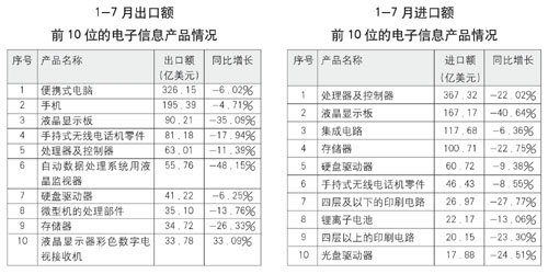 圖一:1~7月出口額(進(jìn)口額)錢10位電子信息產(chǎn)品情況