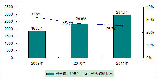 圖3 2009-2011年中國汽車電子市場(chǎng)規(guī)模與增長(zhǎng)預(yù)測(cè)