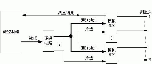 由圖2可見,若以VA作為測量的電壓量,理論上當VA=0時應(yīng)為通路,VA>0時應(yīng)為斷路,且VA的值隨兩測量通道之間的電阻值的不同而變化。但由于模擬多路開關(guān)本身有不可忽略的導(dǎo)通電阻RON,這樣,在測量通路形成后,若為通路,VA并不等于0,而是等于RON上的電壓降。由于測量的目的只是獲知通/斷路關(guān)系,沒有必要去測量VA的具體值,為此只需用電壓比較器比較VA是否大于RON上的電壓降即可。設(shè)置電壓比較器的閾值電壓等于RON上的電壓降,電壓比較器的輸出就是測量結(jié)果,該結(jié)果為可直接由微控制器讀取的數(shù)字量。