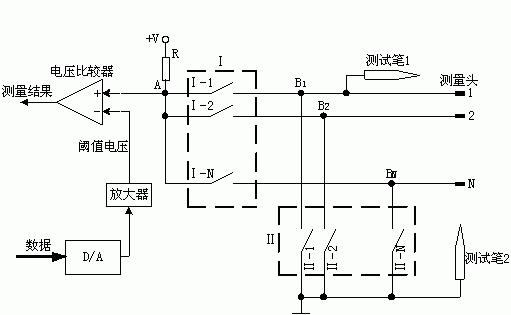 實現(xiàn)自動測量的前提是將被測元件引腳連入探測電路中,為此探測設(shè)備設(shè)置若干個測量頭,通過電纜引出,測量頭可掛接各種測試夾具與元件引腳建立連接,測量頭的數(shù)量決定了同一批連入探測電路的引腳數(shù)。然后在程序控制下探測儀按組合原則依次將被測"引腳對"一一納入測量通路。在測量通路中將"引腳對"之間的通/斷路狀況呈現(xiàn)為引腳間有無電阻,測量通路將其轉(zhuǎn)換為一個電壓量,由此判斷它們之間的通/斷路關(guān)系并加以記錄。