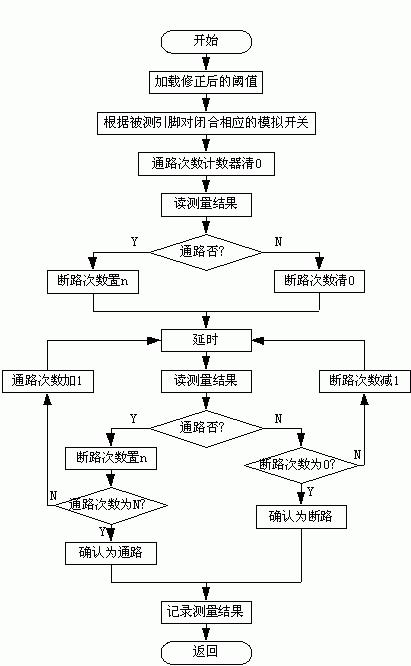 為了消除電容元件和模擬開關(guān)抖動的影響需要延長測量時間,而要消除電感元件的影響,則要利用感生電動勢在很短時間內(nèi)確定,為此程序中設(shè)置了兩個計數(shù)器:通路次數(shù)計數(shù)器和斷路次數(shù)計數(shù)器。設(shè)置通路次數(shù)N是為了消除模擬開關(guān)閉合瞬間由于電容充電產(chǎn)生的假通路影響,即當累計讀得N次通路結(jié)果時,一般對電容的充電已結(jié)束,才確認被測量點間為通路。設(shè)置斷路次數(shù)n是為了排除模擬開關(guān)抖動所引起的干擾,一般在連續(xù)測得n次斷路結(jié)果時表明模擬開關(guān)的抖動已經(jīng)結(jié)束,才能確認為斷路。但因為電感的感生電動勢在模擬開關(guān)閉合瞬間最大,隨后迅速下降,所以如果第一次和第二次測量結(jié)果都為斷路,則確認為斷路。由于幾種情況之間互相矛盾,計數(shù)器及延時的值是在權(quán)衡三種情況的基礎(chǔ)上根據(jù)實際情況確定的。