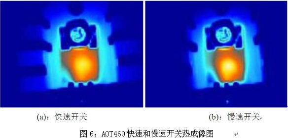 圖6為AOT460在同一應用中快速開關(guān)和慢速開關(guān)情況下的熱成像照片??梢钥闯觯诼匍_關(guān)情況下MOSFET的局部溫度要高于快速開關(guān)情況下的溫度,過慢的開關(guān)速度會導致MOSFET因局部溫度過高而提前失效。
