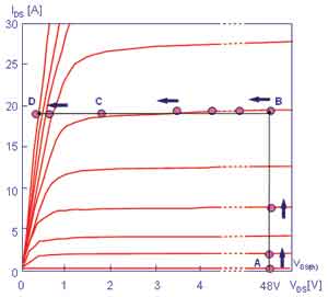 三極管有三個(gè)工作區(qū):截止區(qū)、放大區(qū)和飽和區(qū),MOSFET對(duì)應(yīng)是關(guān)斷區(qū)、恒流區(qū)和可變電阻區(qū)。注意:MOSFET恒流區(qū)有時(shí)也稱飽和區(qū)或放大區(qū)。當(dāng)驅(qū)動(dòng)開(kāi)通脈沖加到MOSFET的G和S極時(shí),Vgs的電壓逐漸升高時(shí),MOSFET的開(kāi)通軌跡A-B-C-D如圖3中的路線所示。