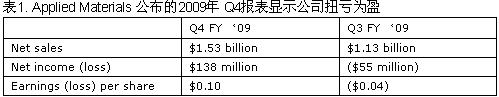 Applied Materials 近日公布的09年第4季財報顯示公司已扭虧為盈,凈收入實(shí)現(xiàn)1.38億美元,而上季虧損為5500萬美元。其Q4銷售額為15.3億美元,其中半導(dǎo)體設(shè)備銷售占6.56億美元,公司同時已收到了6.29億美元的半導(dǎo)體設(shè)備新訂單。