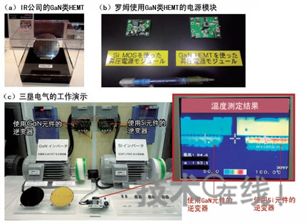 為了降低成本,使用Si底板的展出接連不斷。IR展出了形成有GaN類HEMT的晶圓(a)。羅姆也首次試制使用Si底板的GaN類HEMT并展出了電源模塊(b)。三墾電氣使用配備有6個SBD內(nèi)置GaN類FET的逆變器驅(qū)動200V、2.2kW的3相交流馬達,與利用配備Si制IGBT和FRD的逆變器進行驅(qū)動時逆變器表面溫度的變化進行了比較(c)。左側(cè)配備GaN元件的逆變器損失小且溫度低。美國國際整流器公司(International Rectifier,IR)宣布在2009年內(nèi)投入實用。首先投產(chǎn)的將是使用耐壓僅為數(shù)十V的GaN類HEMT的POL電源模塊,為無需加載柵極電壓即可導通的“常開”型。
