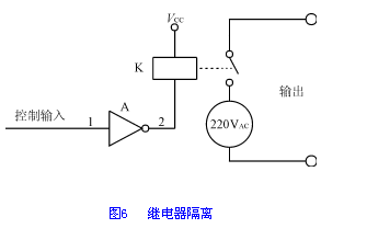繼電器是常用的數(shù)字輸出隔離元件,用繼電器作為隔離元件簡單實用,價格低廉。圖6是繼電器輸出隔離的實例示意圖。在該電路中,通過繼電器把低壓直流與高壓交流隔離開來,使高壓交流側的干擾無法進入低壓直流側。