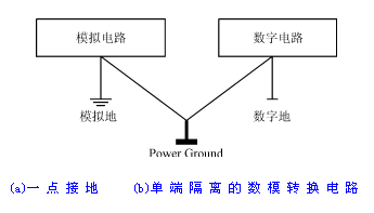 一般地說,模擬電路與數(shù)字電路之間的轉換通過模數(shù)轉換器(A/D)或數(shù)模轉換器(D/A)來實現(xiàn)。但是,若不采取一定的措施,數(shù)字電路中的高頻振蕩信號就會對模擬電路帶來一定的干擾,影響測量的精度。為了抑制數(shù)字電路對模擬電路帶來的高頻干擾,一般須將模擬地與數(shù)字地分開布線,參見圖7(a)。這種布線方式不能徹底排除來自數(shù)字電路的高頻干擾,要想排除來自數(shù)字電路的高頻干擾,必須把數(shù)字電路與模擬電路隔離開來,常用的隔離方法是在A/D轉換器與數(shù)字電路之間加入光電耦合器,把數(shù)字電路與模擬電路隔離開,參見圖7(b)。但這種電路還不能從根本上解決模擬電路中的干擾問題,仍然存在著一定的缺陷,這是因為信號電路中的共模干擾和差模干擾沒有得到有效的抑制,對于高精密測量的場合,還不能滿足要求。對于具有嚴重干擾的測量場合,可采用圖7(c)所示的電路。在該電路中,把信號接收部分與模擬處理部分也進行了隔離,因為在前置處理級與模數(shù)轉換器(A/D)之間加入線性隔離放大器,把信號地與模擬地隔開,同時在模數(shù)轉換器(A/D)與數(shù)字電路之間采用光電耦合器隔離,把模擬地與數(shù)字地隔開,這樣一來,既防止了數(shù)字系統(tǒng)的高頻干擾進入模擬部分,又阻斷了來自前置電路部分的共模干擾和差模干擾。當然,這種系統(tǒng)的造價較高,一般只用于高精度的測量系統(tǒng)中。