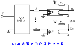 數(shù)模轉換(D/A)電路的隔離與模數(shù)轉換(A/D)電路的隔離類似,因而所采取的技術措施也差不多,圖7(d)是數(shù)模轉換(D/A)電路的隔離方法之一。