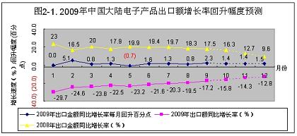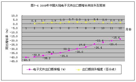 2009年1~9月份,中國(guó)大陸電子組件出口額增長(zhǎng)率從元月份的-40.3%,回升到9月份的-24.4%。回升了15.9個(gè)百分點(diǎn)。按此回升速度計(jì)算,到今年年底,可回升到-18.4%(見(jiàn)圖7-4)。