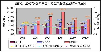 據(jù)中國(guó)半導(dǎo)體行業(yè)協(xié)會(huì)統(tǒng)計(jì),今年1~9月份IC設(shè)計(jì)業(yè)、制造業(yè)和封裝業(yè)的銷售收入分別比2008年增長(zhǎng)10.2%、-25.4%和-37.2%,制造業(yè)和封裝業(yè)下降幅度較大。預(yù)計(jì)2010年會(huì)隨著國(guó)內(nèi)經(jīng)濟(jì)和出口形勢(shì)的好轉(zhuǎn),將逐步回升到小幅度正增長(zhǎng)(見(jiàn)圖5-1、5-2)。