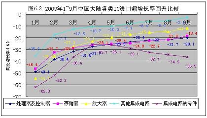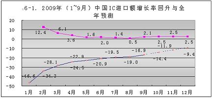 今年1~9月份,中國(guó)大陸進(jìn)口集成電路的降幅不斷回升,從元月份的-46.6%,回升到9月份的-16.9%。共回升了29.7個(gè)百分點(diǎn)。按此回升速度,到今年年底可回升到-9.4%(見(jiàn)圖6-1)。