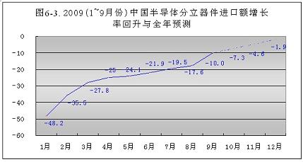 今年1~9月份,半導(dǎo)體分立器件進(jìn)口額增長(zhǎng)率回升明顯。從元月份的-48.2%,回升到9月份的-10.0%,共回升了38.2個(gè)百分點(diǎn)。按此回升速度,到今年年底可回升到-1.9%(見(jiàn)圖6-3)。