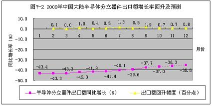 2009年1~9月份,中國(guó)大陸半導(dǎo)體分立器件出口額增長(zhǎng)率從元月份的-43.4%,回升到9月份的-37.7%。只回升了5.7個(gè)百分點(diǎn)。按此回升速度計(jì)算,到今年年底,只能回升到-35.5%,預(yù)計(jì)2010年會(huì)有所好轉(zhuǎn)(見(jiàn)圖7-2)。