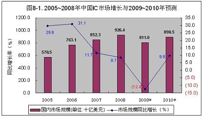 2009年,受國(guó)際金融危機(jī)影響,電子產(chǎn)品出口受阻,整機(jī)產(chǎn)量有所下降,國(guó)內(nèi)集成電路的需求規(guī)模,同2008年相比將下降12.4%,約為811億美元(見(jiàn)圖8-1)。其中,90%左右仍靠進(jìn)口。