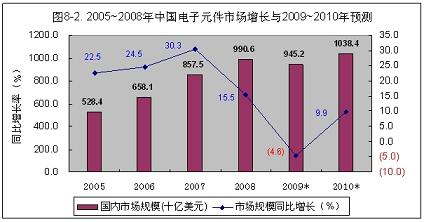 2009年,國(guó)內(nèi)電子組件市場(chǎng)需求規(guī)模,同2008年相比將下降4.6%,約為945.2億美元(見(jiàn)圖8-2)。其中,60%左右仍靠進(jìn)口。