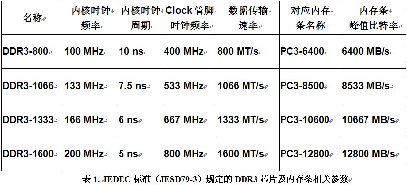 下表列出了JEDEC標(biāo)準(zhǔn)(JESD79-3)規(guī)定的DDR3芯片及內(nèi)存條相關(guān)參數(shù)。需要說明的是,如前所述,并不是所有的內(nèi)存產(chǎn)品都完全遵從JEDEC標(biāo)準(zhǔn),有些廠商會生產(chǎn)速度更高速的DDR3芯片,一般情況下這些芯片是從芯片檢測流程中篩選出來的頻率動(dòng)態(tài)范圍更大的芯片,或者是可加壓超頻工作的芯片。