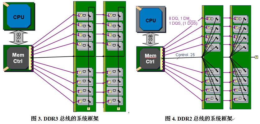 在系統(tǒng)設(shè)計(jì)方面DDR3與DDR2最大的區(qū)別在于DDR3將時(shí)鐘、地址及控制信號線的終端電阻從計(jì)算機(jī)主板移至內(nèi)存條上,這樣一來在主板上將不需要任何端接電阻。為了盡可能減小信號反射,在內(nèi)存條上包括時(shí)鐘線在內(nèi)的所有控制線均采用Fly-by拓?fù)浣Y(jié)構(gòu)。同時(shí),也是因?yàn)镕ly-by的走線結(jié)構(gòu)致使控制信號線到達(dá)每顆內(nèi)存顆粒的長度不同從而導(dǎo)致信號到達(dá)時(shí)間不一致。這種情況將會影響內(nèi)存的讀寫過程,例如在讀操作時(shí),由于從內(nèi)存控制器發(fā)出的讀命令傳送到每顆內(nèi)存芯片的時(shí)間點(diǎn)不同,將導(dǎo)致每顆內(nèi)存芯片在不同的時(shí)間向控制器發(fā)送數(shù)據(jù)。為了消除這種影響,需要在對內(nèi)存進(jìn)行讀寫等操作時(shí)對時(shí)間做補(bǔ)償,這部分工作將由內(nèi)存控制器完成。DDR3總線的系統(tǒng)框架如下圖所示,其中紅線代表DQ、DM以及差分DQS信號線,黑線代表時(shí)鐘、地址及控制信號線,T代表相應(yīng)的端接電阻。