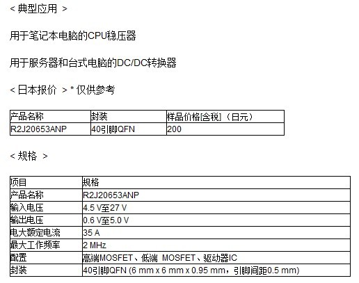 長期以來,瑞薩一直在提供符合DrMOS標準的一系列產(chǎn)品,尤其是輸出電壓為12V的服務(wù)器和臺式電腦。新的R2J20653ANP將可承載的輸入電壓擴展到適用于筆記本電腦的20V適配器電壓,成為瑞薩高電壓容限電源類的首款產(chǎn)品。這款產(chǎn)品的推出有助于筆記本用CPU電源在實現(xiàn)更加小型化的同時,達到更高的性能,并且有望帶動DrMOS標準更加廣泛的應(yīng)用。