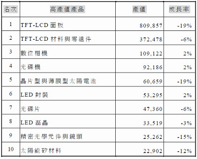 2009年臺灣地區(qū)1兆7,247億新臺幣的光電產(chǎn)值約相當(dāng)522億美元,擁有16%的全球市場占有率。臺灣地區(qū)有幾項(xiàng)產(chǎn)品的世界占有率仍能維持全球前三大,包括LED芯片、LED封裝、TFT LCD材料與零組件、TFT LCD面板、數(shù)字相機(jī)代工、光驅(qū)與光盤片,和光學(xué)鏡片,以及結(jié)晶硅太陽電池等。與往年類似,這十大產(chǎn)品即占有臺灣地區(qū)整體光電產(chǎn)值的94%比例。