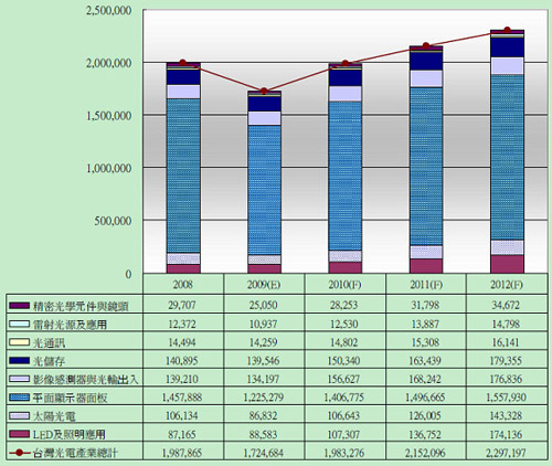 所幸景氣在2009年第一季跌到谷底之后便開始逐步回升,至第四季才確定恢復(fù)熱絡(luò)的景象。但是臺灣地區(qū)光電產(chǎn)業(yè)還是難抵金融風(fēng)暴的余威,整體產(chǎn)值下滑了13%,到1兆7,247億新臺幣。如原本所預(yù)估的,金融風(fēng)暴會(huì)犧牲掉兩年的成長率;保守預(yù)期臺灣地區(qū)光電產(chǎn)業(yè)將于2010年重拾成長,再度站回接近2兆新臺幣之規(guī)模。