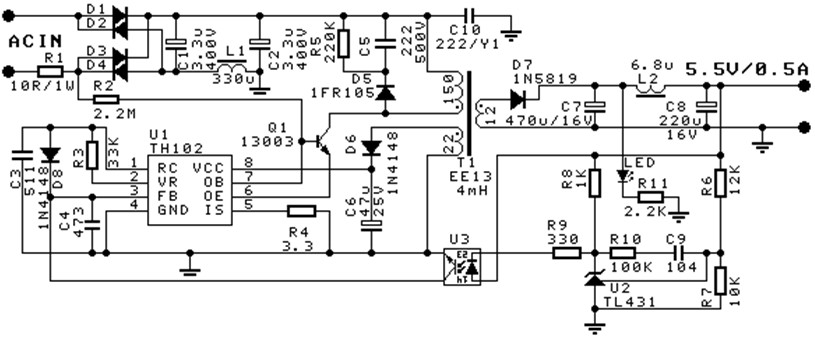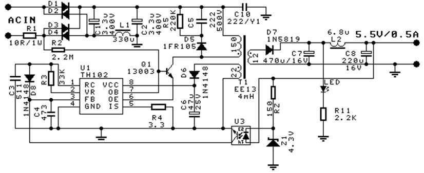 TH102采用穩(wěn)壓管、光耦發(fā)光管(圖2中Z1、U3、RZ)為輸出電壓基準,RZ基于光耦發(fā)光管壓降為Z1提供基電流,改變該基電流(既改變RZ)可小幅改變Z1穩(wěn)壓值,因此,若需較高精度輸出電壓可調(diào)校RZ,調(diào)校RZ可采用成批穩(wěn)壓管分為幾檔,每檔穩(wěn)壓管對應一個RZ;或TH102采用TL431(圖3中U2、R6、R7、R8、R9、R10、C9)電路為輸出電壓基準,基準精度較高和無需調(diào)校。TH102采用光耦隔離反饋電路(圖2中Z1、U3、RZ、C4,圖3中U2、R6、R7、R8、R9、R10、C9、C4)。