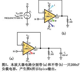 如果你能確定IC通過(guò)信號(hào)的特性,就可以用Spice來(lái)估算功耗。此時(shí)必須保證使用恰當(dāng)?shù)腟pice模型,它們對(duì)一些測(cè)試信號(hào)給出合理的結(jié)果,而功耗計(jì)算此時(shí)沒(méi)有價(jià)值。圖5表示一個(gè)Spice圖。芯片的功耗不同于到達(dá)負(fù)載的功率。圖6是圖5示意圖的Spice曲線圖。它以紅線表示啟動(dòng)的振蕩。電路是否會(huì)發(fā)生這種振蕩只是個(gè)人的猜測(cè),但它應(yīng)該會(huì)使你在建立原型后查看這種行為。記住,在OrcadCapture上點(diǎn)擊W鍵只能顯示芯片的靜態(tài)功耗。要獲得工作時(shí)的功耗,要用示意圖上的功率標(biāo)記,然后用曲線程序的rms-math函數(shù),給出器件的平均功耗。