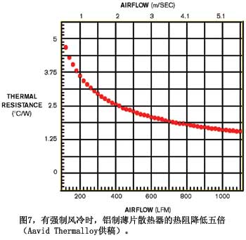 對(duì)流散熱也有一些困難。例如,氣流對(duì)商用散熱片的影響(圖7)。注意,在高溫下,熱阻會(huì)增加五倍。使用強(qiáng)制風(fēng)冷的散熱片有較薄、間距更近的鰭片,比如一款風(fēng)扇式CPU冷卻器。如果你的產(chǎn)品沒(méi)有風(fēng)扇,則IC產(chǎn)生的熱量會(huì)傳導(dǎo)和散播出來(lái),然后傳送到機(jī)內(nèi)的空氣中。接下來(lái),隨著整個(gè)機(jī)器溫度的上升,熱量通過(guò)對(duì)流傳送給周圍的空氣,如果你把機(jī)器放在腿上,則部分熱量也會(huì)傳導(dǎo)過(guò)來(lái)。外殼材料的熱阻就變得很重要。熱量從內(nèi)向外的傳送速度,塑料殼要慢于金屬殼。