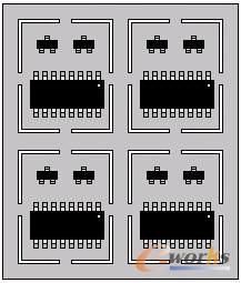 在對外形尺寸較小或外形不規(guī)則的PCB進行裝聯(lián)時,會受到很多限制,所以一般采用拼板的方式來使幾個小的PCB拼接成合適尺寸的PCB進行裝聯(lián),如圖5。一般單邊尺寸小于150mm的PCB,都可以考慮采用拼板方式,通過兩拼﹑三拼﹑四拼等,將大PCB的尺寸拼至合適的加工范圍,通常寬150mm~250mm,長250mm~350mm的PCB是自動化裝聯(lián)中比較合適的尺寸。