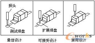 圖6所示為測試點設計的一個示例。通過延伸線在元器件引線附近設置測試焊盤或利用過孔焊盤測試節(jié)點,測試節(jié)點嚴禁選在元器件的焊點上,這種測試可能使虛焊節(jié)點在探針壓力作用下擠壓到理想位置,從而使虛焊故障被掩蓋,發(fā)生所謂的“故障遮蔽效應”。由于探針因定位誤差引起的偏晃,可能使探針直接作用于元器件的端點或引腳上而造成元器件損壞。