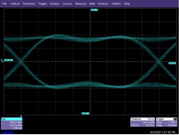 信號經(jīng)過背板和連接器,到達接收端,信號變差,眼圖變小,如圖8、圖9所示。如果不使用均衡技術(shù),系統(tǒng)很容易出現(xiàn)誤碼,因此在高速接收芯片內(nèi)部通常需要嵌入均衡器。