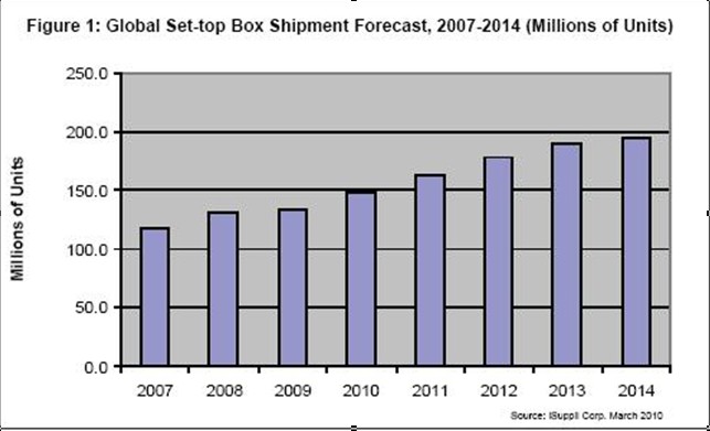 據(jù)iSuppli公司,機(jī)頂盒出貨量未來幾年將繼續(xù)增長(zhǎng)。消費(fèi)者收看模式發(fā)生轉(zhuǎn)變,通過互聯(lián)網(wǎng)提供的電視內(nèi)容越來越流行,從而將為提供商創(chuàng)造條件,在數(shù)字家庭的激烈爭(zhēng)奪中獲得新的營(yíng)業(yè)收入來源。